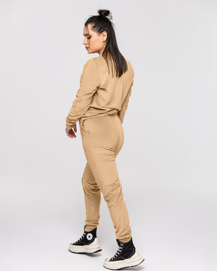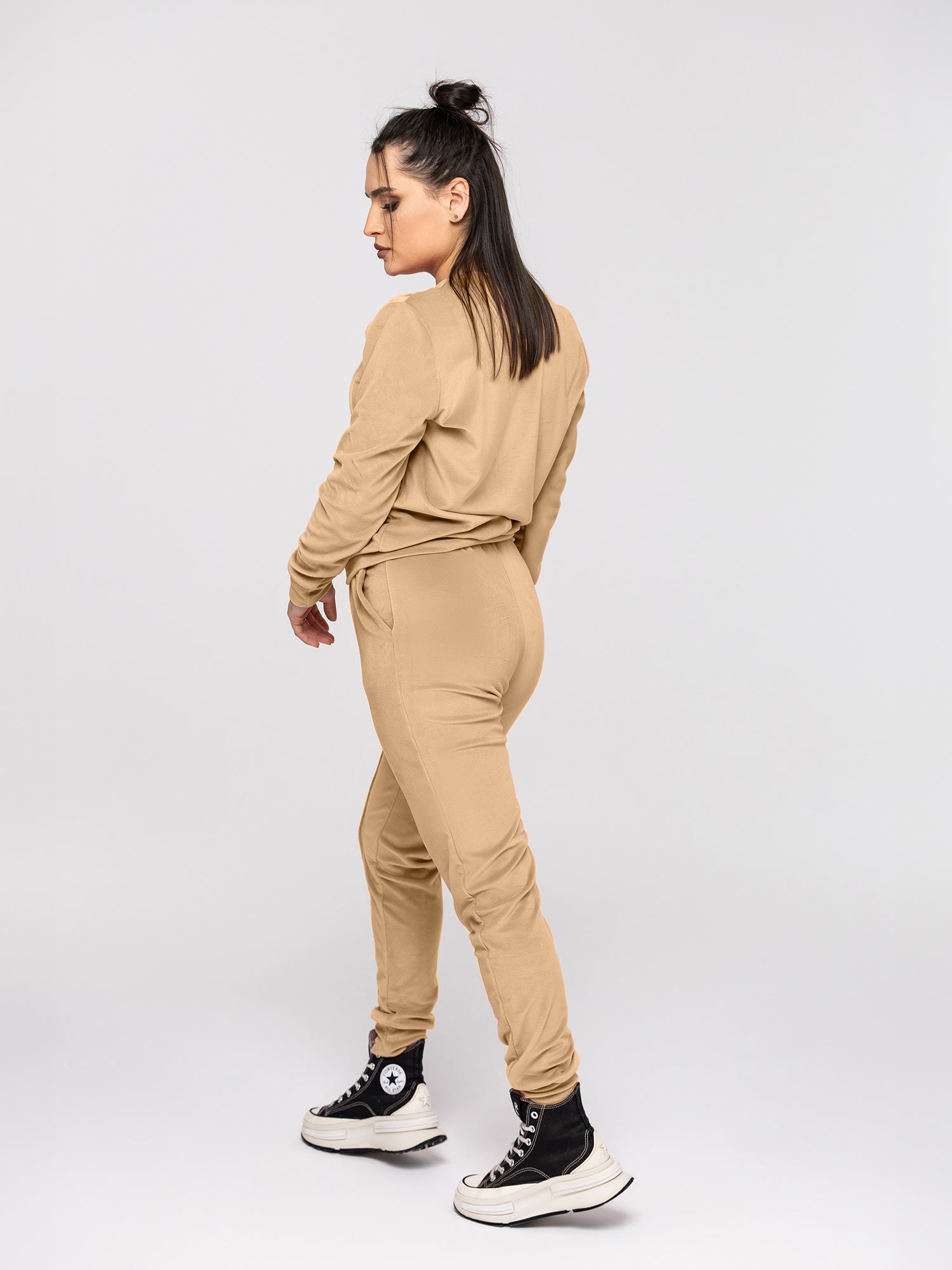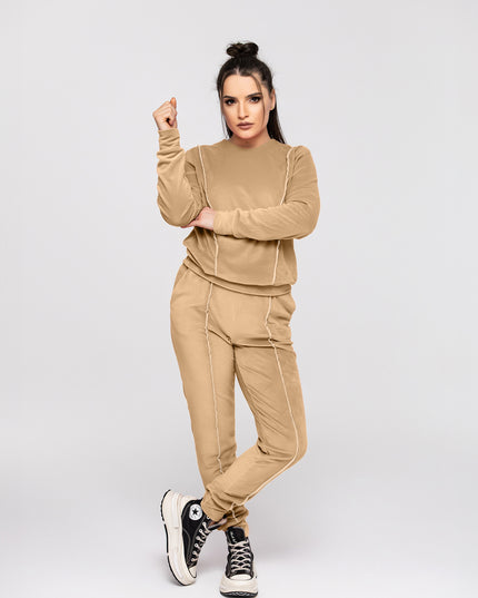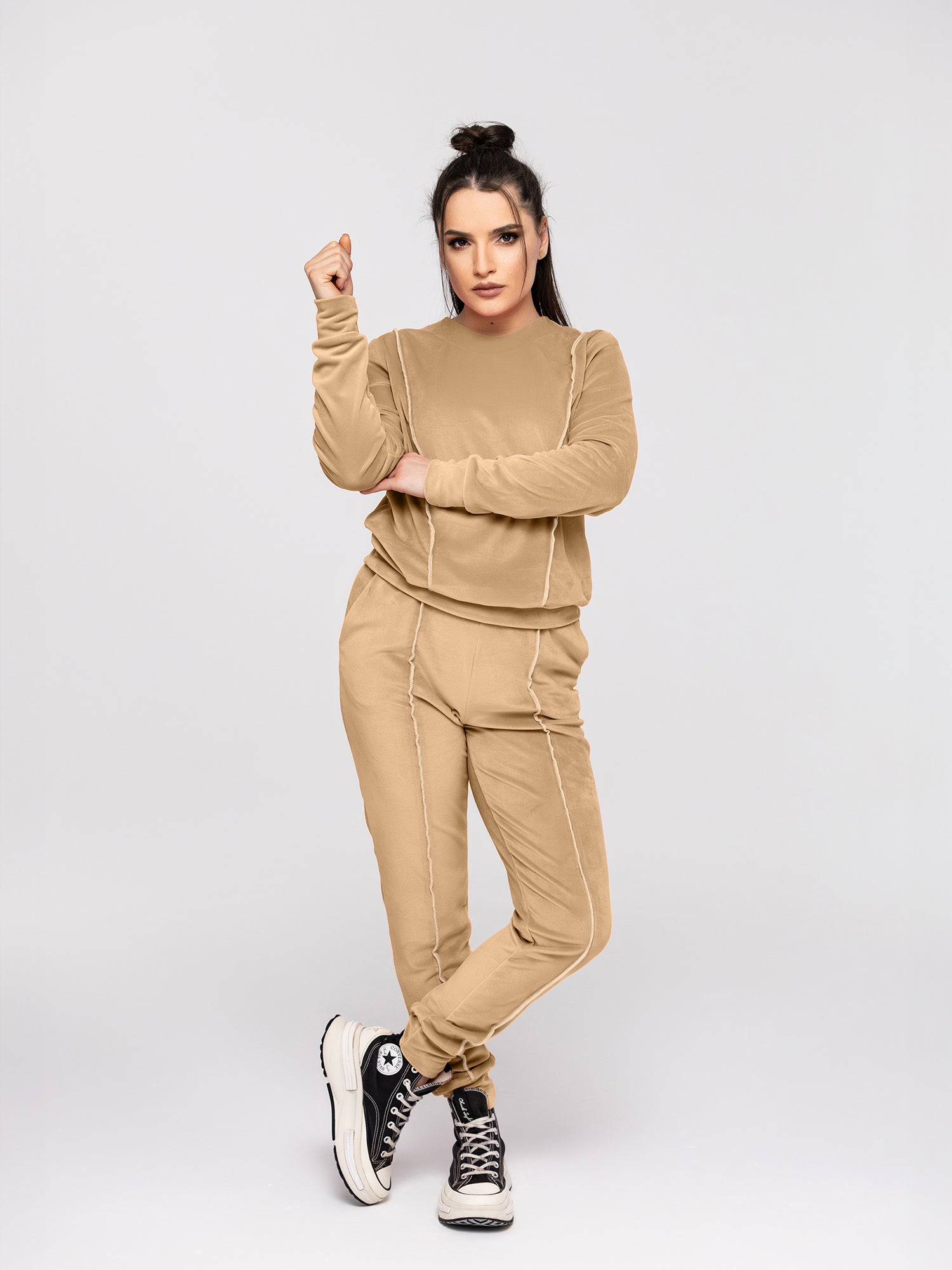 • Pantaloni conici, cu talie elastică, buzunare laterale încăpătoare și manșete la gleznă, prevăzuți cu aceleași două cusături cu ață albă, care continuă designul bluzei, oferind un look unitar și elegant